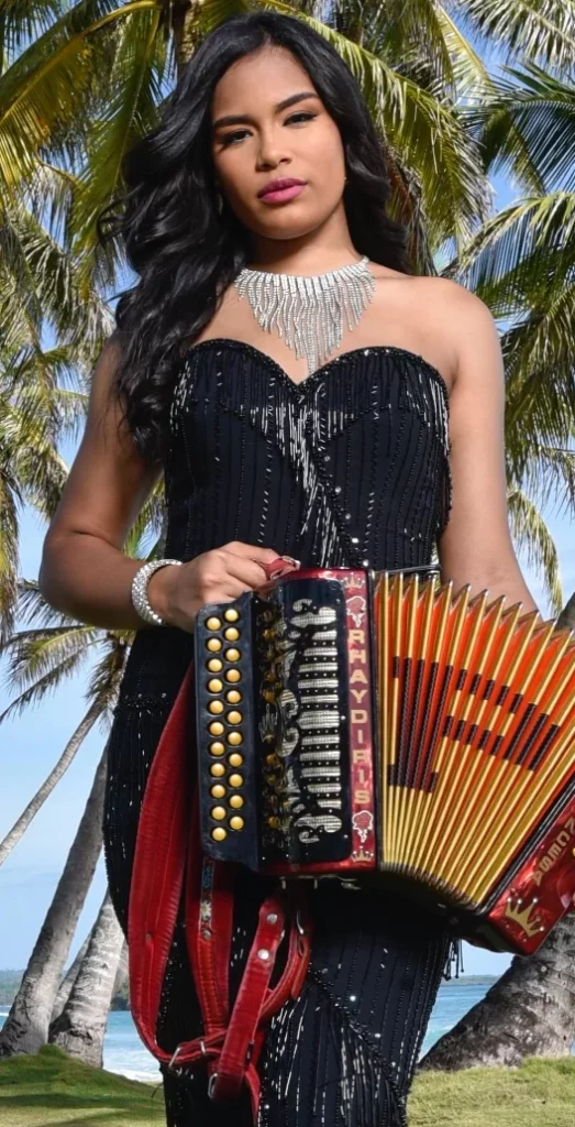 La acordeonista y compositora María Díaz ‘La Reyna’ tiene su diseñadora exclusiva que lleva muchos años realizando los diseños acordes con el estilo que la identifican.