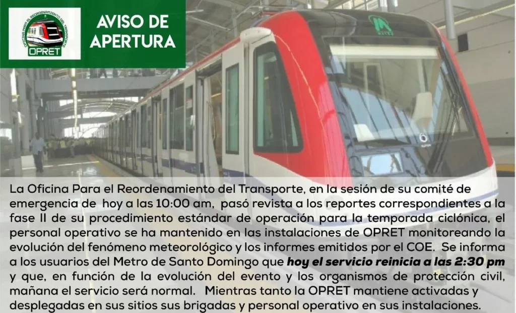 "Se informa a los usuarios del Metro de Santo Domingo que hoy el servicio reinicia a las 2:30 de la tarde y que en función de la evolución del evento y los organismos de Protección Civil mañana el servicio será norma", señala la Opret a través de su cuenta de Twitter OPRET_RD.
