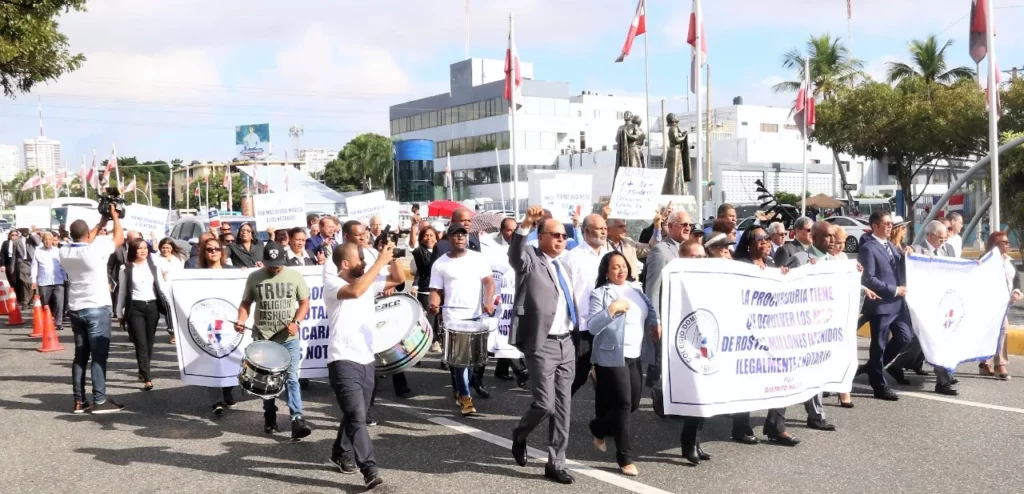 Santo Domingo.– Decenas de miembros del Colegio Dominicano de Notarios realizaron este martes una marcha pacífica en el Centro de los Héroes que culminó en el edificio de la Procuraduría General de la República, en reclamo de que ese organismo le entregue más de 113 millones de pesos que le retiene ilegal e injustificadamente, en perjuicio del gremio.