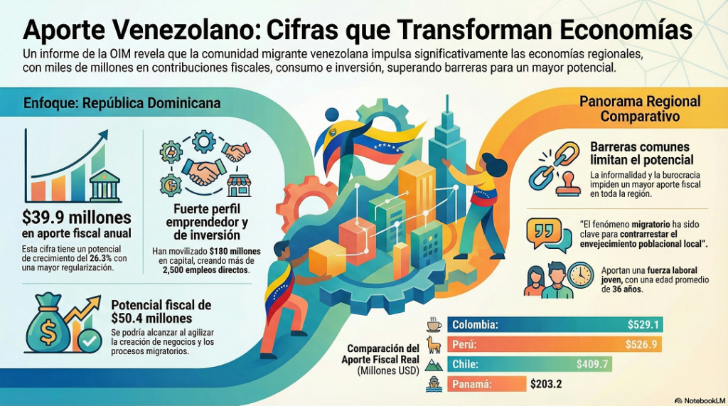 Ciudad de Panamá. – República Dominicana figura entre los países de América Latina que han recibido mayor aporte fiscal de la comunidad migrante venezolana, según un informe de la Organización Internacional para las Migraciones (OIM).