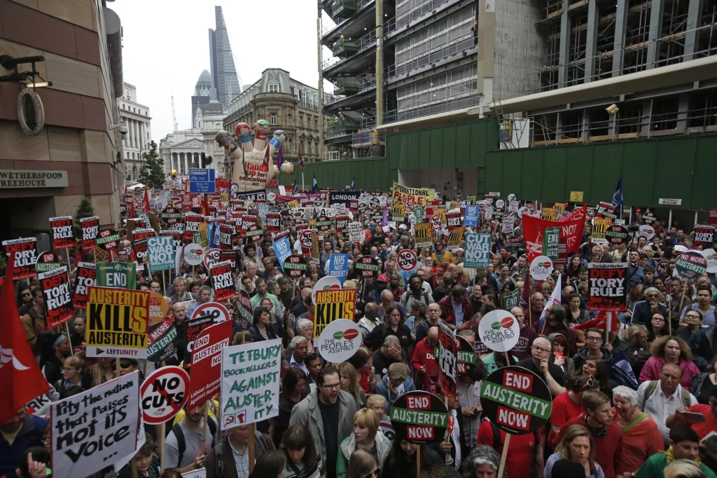 Tras concentrarse en la plaza de Trafalgar, una parte de los manifestantes avanzó hacia la plaza del Parlamento, donde gritaron consignas ante el palacio de Westminster.