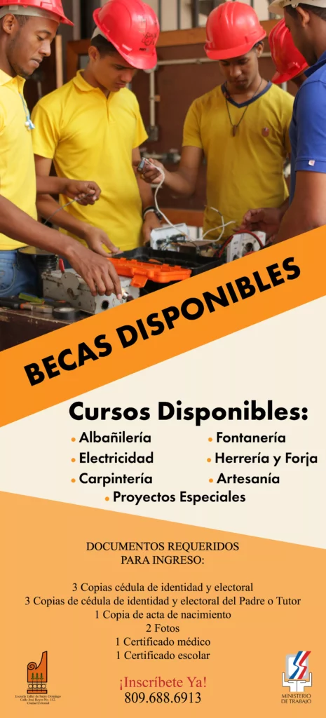 Santo Domingo-El Ministerio de Trabajo, a través de la Escuela Taller de Santo Domingo, inició el proceso de inscripción para los jóvenes interesados en formarse en distintas áreas técnicas y cursos especializados de manera gratuita.