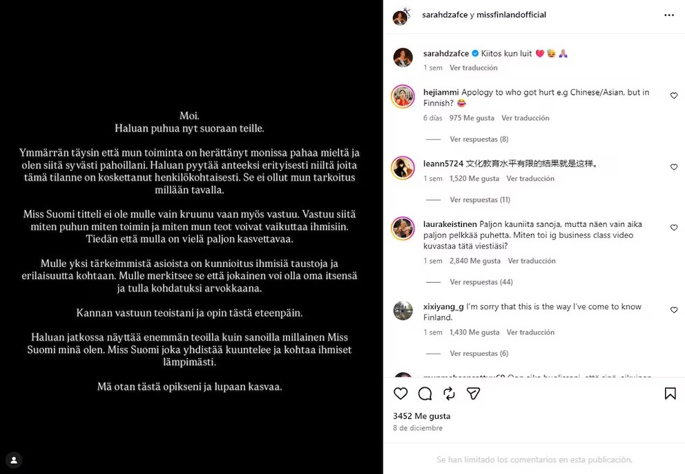 Dzafce, de 22 años, emitió un mensaje de disculpas a través de su cuenta de Instagram, en el que aseguró que no tuvo la intención de ofender y afirmó que el respeto por las personas y sus diferencias es uno de sus valores fundamentales. Sin embargo, el pronunciamiento fue duramente criticado por usuarios asiáticos, tanto por haber sido publicado inicialmente en finés como por considerarse insuficiente ante la gravedad del agravio.