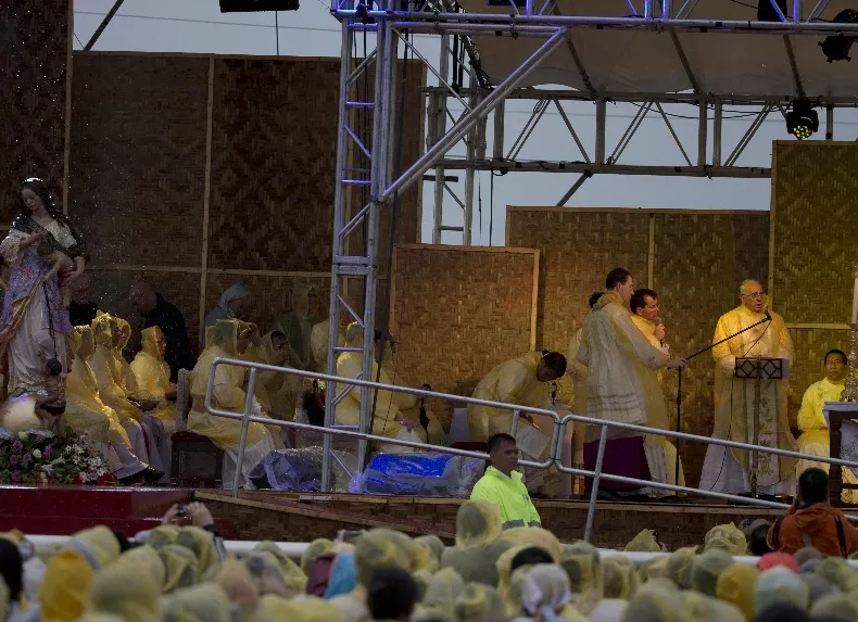 El andamio, sobre el que se encontraba uno de los altavoces, se derrumbó por los fuertes vientos causados por la tormenta Mekkhala, que se dirige hacia la zona y obligó a acortar casi cuatro horas la visita a la ciudad del pontífice, quien ya regresó a Manila.