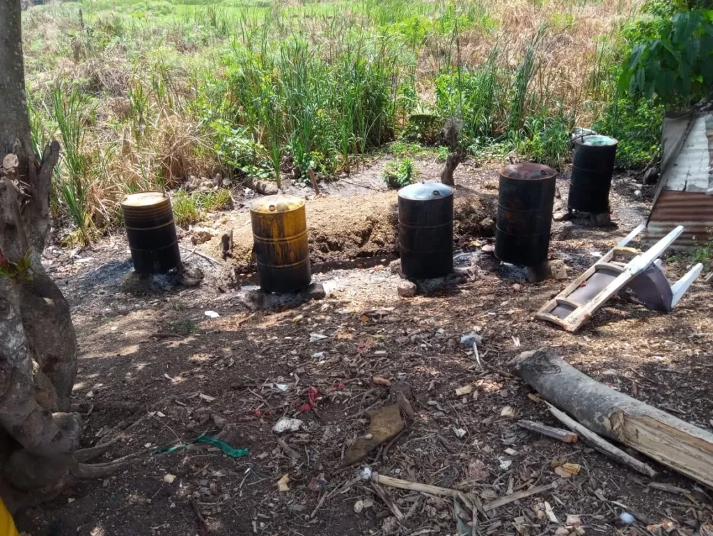 Los agentes actuantes, al inspeccionar el lugar, confiscaron 19 tanques de 55 galones de distintos colores con materia prima para la elaboración de bebidas como "pitrinche o clerén" junto a dos tinacos de forma cuadrada.