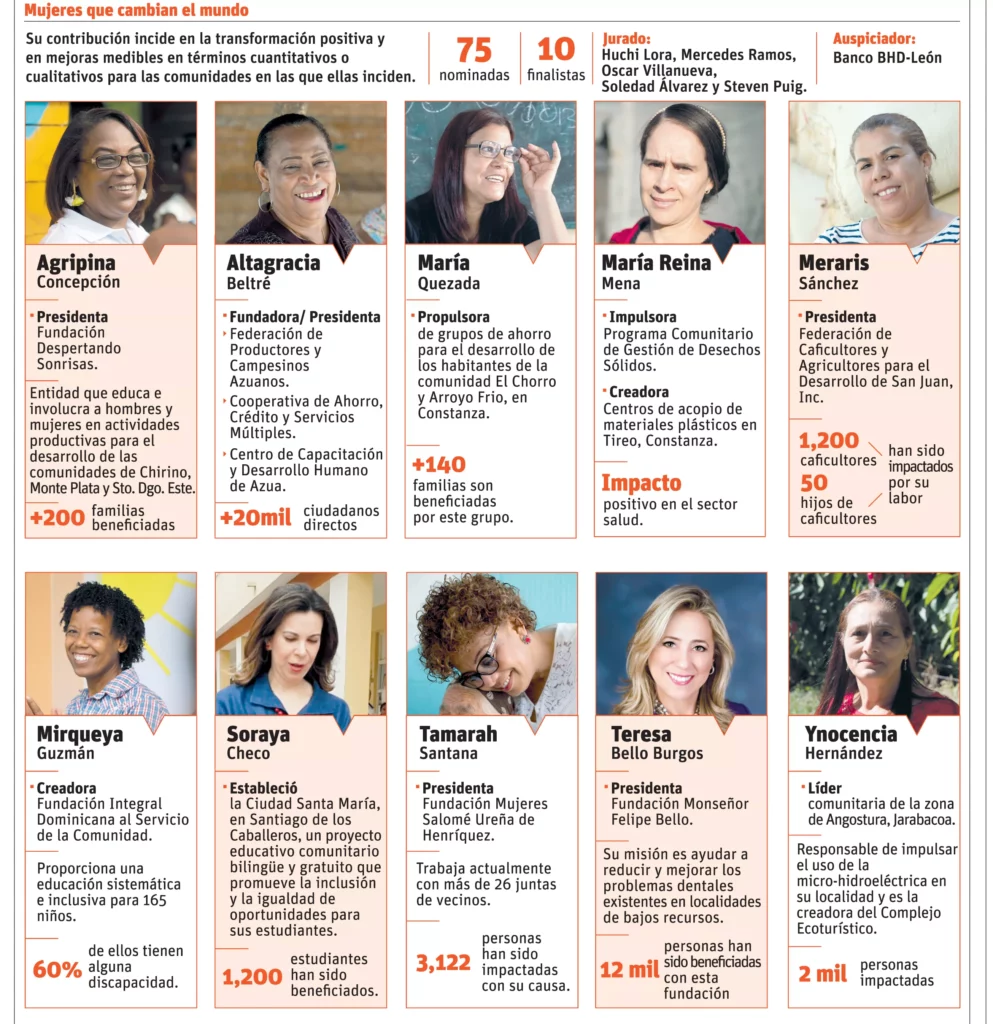 Desde hace cinco años el Banco BHD León desarrolla esta iniciativa que lleva como nombre “Mujeres que cambian el mundo” y se aboca a su quinta entrega luego de seleccionar las diez finalistas de esta edición, escogida entre 75 postuladas.