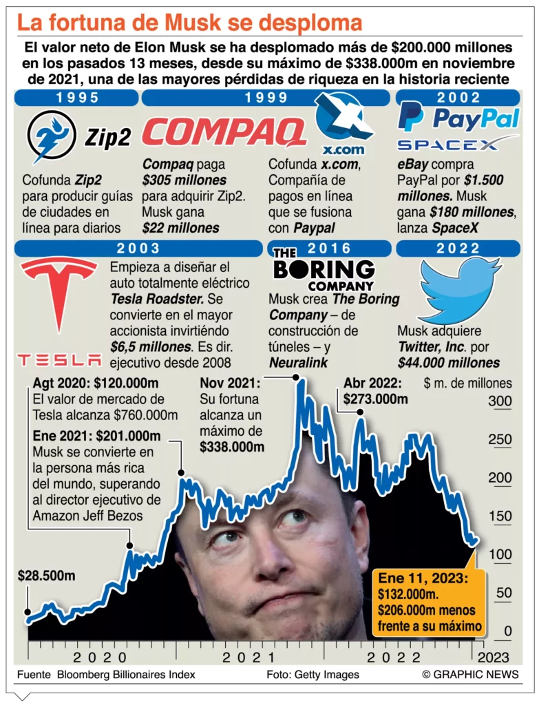 SAN FRANCISCO.-La mayor parte de la fortuna de Elon Musk está vinculada a su participación accionaria en Tesla, que han perdido más de la mitad de su valor desde que asumió el mando de Twitter.