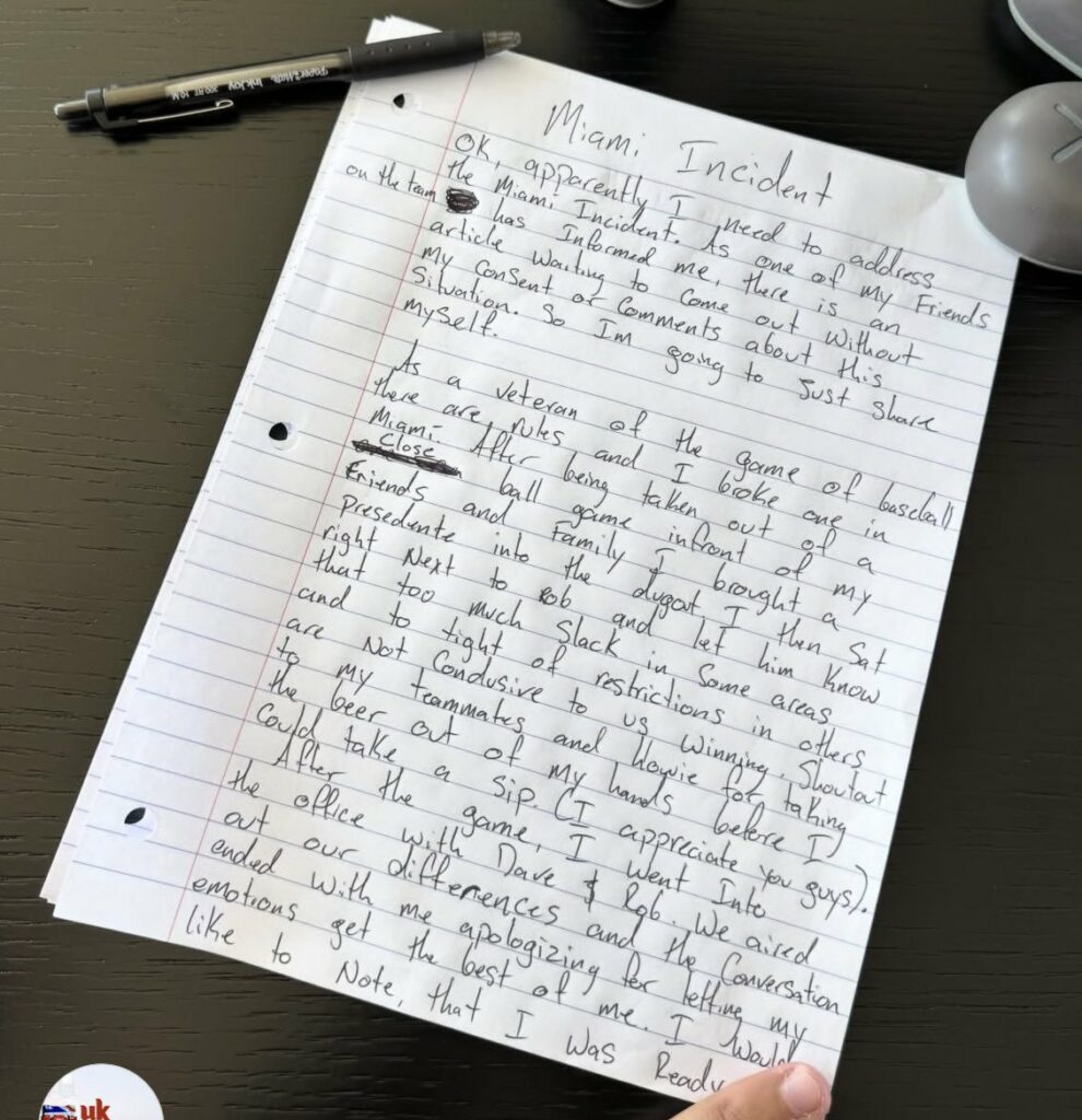Castellanos no tardó en escribir una carta manuscrita de cuatro páginas, que compartió en su cuenta de Instagram, tras la noticia de su liberación. “Como veterano del béisbol, hay reglas, y rompí una en Miami", escribió Castellanos.