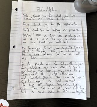 A pesar de los problemas que vivió cerca del final de su carrera con los Phillies, mostró su agradecimiento a la ciudad y a la afición en parte de la carta que compartió en redes sociales.