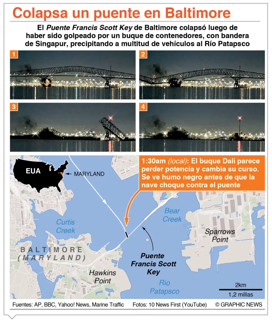 En un comunicado, la autoridad portuaria anunció que “el tráfico de navíos hacia o desde el puerto de Baltimore ha sido suspendido hasta nuevo aviso”, aunque añadió que sus instalaciones siguen procesando camiones en las terminales.