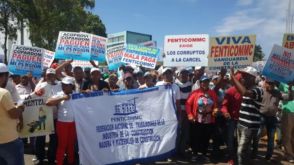 Santo Domingo.- Obreros de la construcción marcharon hoy hasta el Congreso Nacional para exigir que se respete la Ley de Pensiones y se mantengan los privilegios obtenidos.