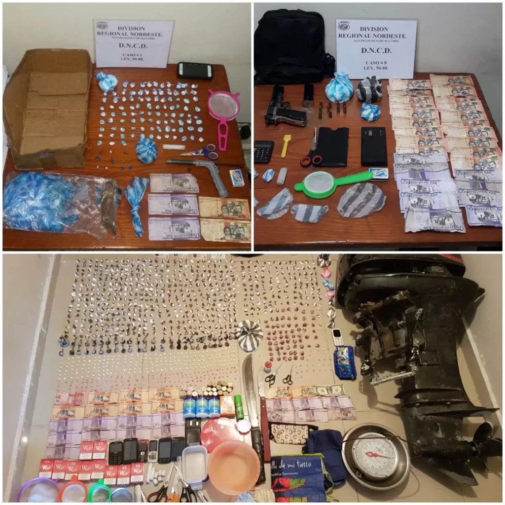 En los últimos operativos contra el tráfico de drogas para el consumo interno se ocuparon dos pistolas, un chaleco antibalas, armas blancas y caseras, cuatro vehículos, 13 motocicletas, decenas de celulares, balanzas, dinero en efectivo y otras evidencias utilizadas por los presuntos distribuidores de sustancias narcóticas.