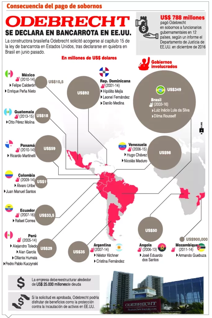 En diciembre de ese año, el Departamento de Justicia de Estados Unidos reveló que Odebrecht había pagado 788 millones de dólares en sobornos a funcionarios gubernamentales en 12 países, incluyendo a la República Dominicana. La firma también comunicó que había presentado su plan de reorganización de la deuda.