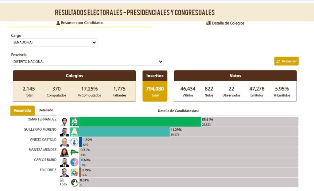 Fernández lleva hasta el momento 25, 823 votos para un 55.61 por ciento, frente a un 19,171 votos para un 41.29% de Guillermo Moreno, candidato por Alianza País y el Partido Revolucionario Dominicano (PRM).