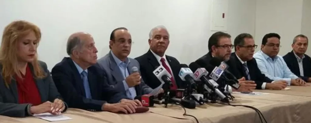 Los partidos de oposición firmantes de la declaración son el Revolucionario Moderno (PRM), Reformista Social Cristiano (PRSC), Alianza País (Alpais), Dominicanos por el Cambio (D x C), Humanista Dominicano (PHD), Frente Amplio (FA), Fuerza Nacional Progresista (FNP), Alianza por la Democracia (APD), Revolucionario Social Demócrata (PRSD), Opción Democrática (OD) y Partido Socialista Cristiano (PSC).