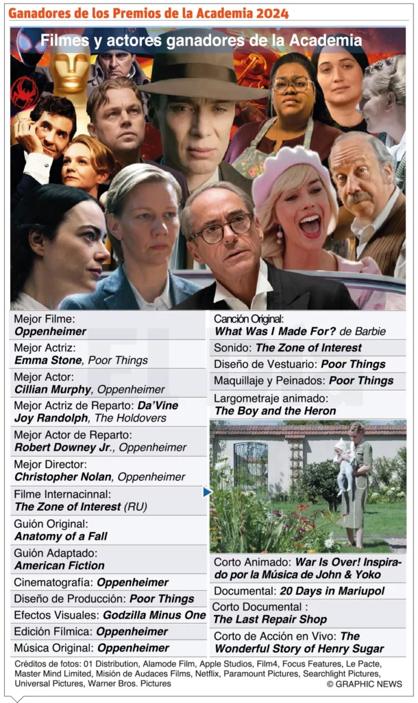 "Oppenheimer", el biopic sobre el padre de la bomba atómica, triunfo en la 96ª edición de los Óscar con siete premios: mejor película, mejor dirección para Christopher Nolan, actor protagonista para Cillian Murphy, actor de reparto para Robert Downey Jr., montaje, dirección de fotografía y banda sonora.