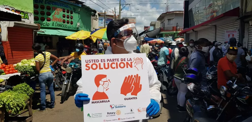 Durante el paso por el mercado público de San Cristóbal, miembros del Plan Estratégico, Club Rotary, Colegio Médico Dominicano, Equipo Creativo, hicieron paradas en la zona para llamar la atención sobre guardar distancia al momento de movilizarse, se noto que muchos comercios y venduteros permanecieron abiertos este martes en el mercado, a pesar de la prohibición.