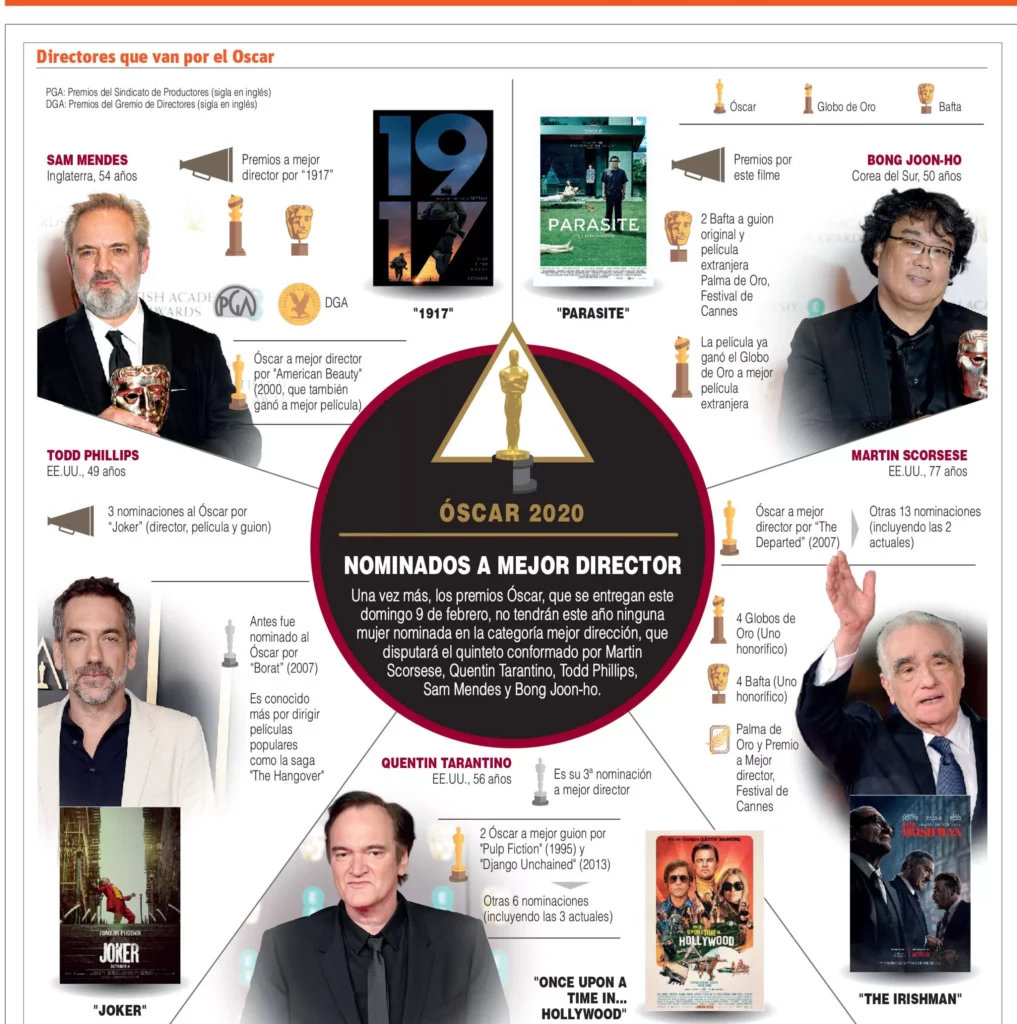 Quentin Tarantino, Martin Scorsese, Sam Mendes, Todd Philips y Bong Joon-ho son los candidatos a la estatuilla al mejor director; todos cuentan en su currículum con, al menos, una obra icónica para el séptimo arte, aunque la alegría por el talento que reunió el apartado este año pronto derivó en decepción: de nuevo ninguna mujer aspira en la categoría.