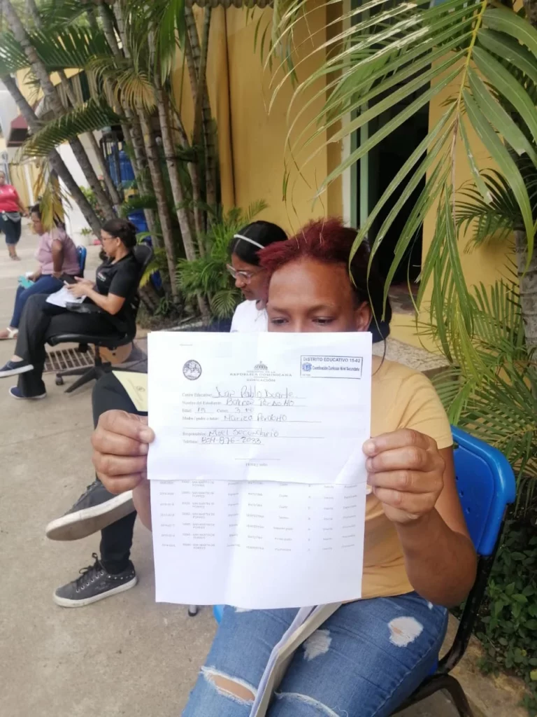 “Mi hijo está en una escuela de Guachupita, y estoy procurando llevarlo a que estudie en el Juan Pablo Duarte, pero es aquí en el Distrito Escolar 15-02 al que corresponde, por eso estoy echando viaje para acá hasta ver que si resuelven, me dieron un papel y estoy en turno”, narró Maritza Perdomo.