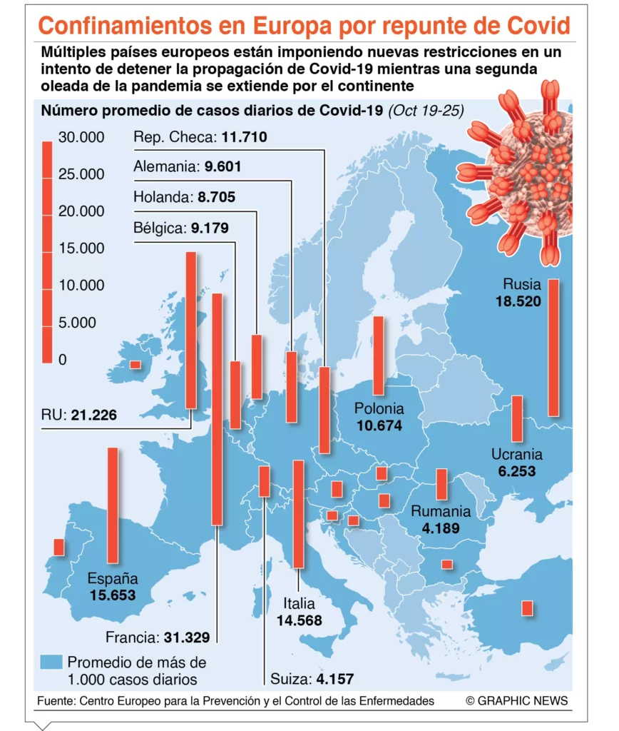 En Italia desde ayer y hasta el 24 de noviembre, los bares y restaurantes echarán el cierre a las 6:00 de la tarde, así como los teatros, cines, gimnasios y piscinas, en un intento del Gobierno de frenar la curva de contagios para evitar un nuevo confinamiento y salvar el periodo navideño. Hay toque de queda en Lacio, cuya capital es Roma, Campania, Sicilia, Calabria y Lombardia.