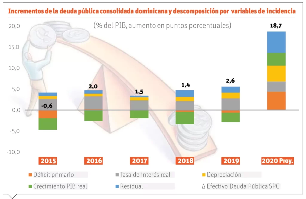 Detalla que en términos consolidados, el aumento de la deuda pública dominicana ha sido mucho mayor que el déficit fiscal.