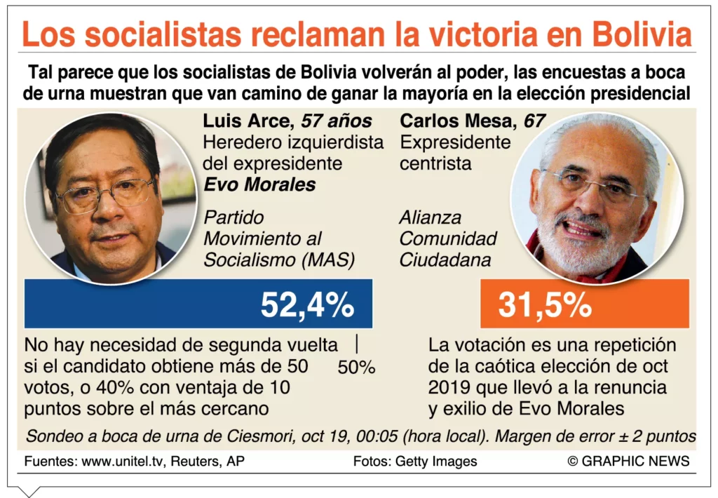En tanto, el candidato Carlos Mesa asumió ayer que su rival electoral Luis Arce será ganador de las elecciones en Bolivia y su formación Comunidad Ciudadana encabezará la oposición.