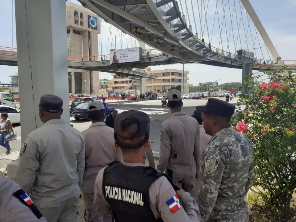 Miembros del Ejército de República Dominicana (ERD) y de la Policía portando armas largas y equipos de protección antimotines permanecen entre las intercepciones de las avenidas Máximo Gómez, John F. Kennedy y 27 de Febrero, además del puente Presidente Peynado que conecta el distrito con Villa Mella y algunas estaciones de combustibles.