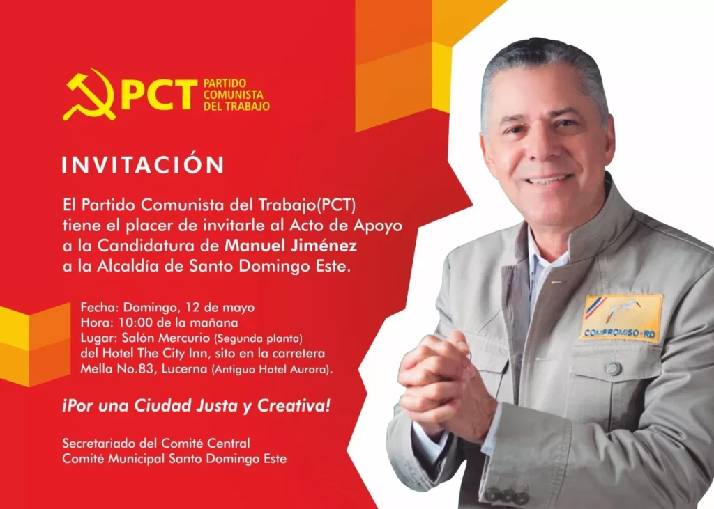 Este domingo, 12 de mayo, el Partido Comunista del Trabajo (PCT), realizará un Acto de apoyo a Manuel Jiménez, aspirante a Alcalde del Municipio Santo Domingo Este.