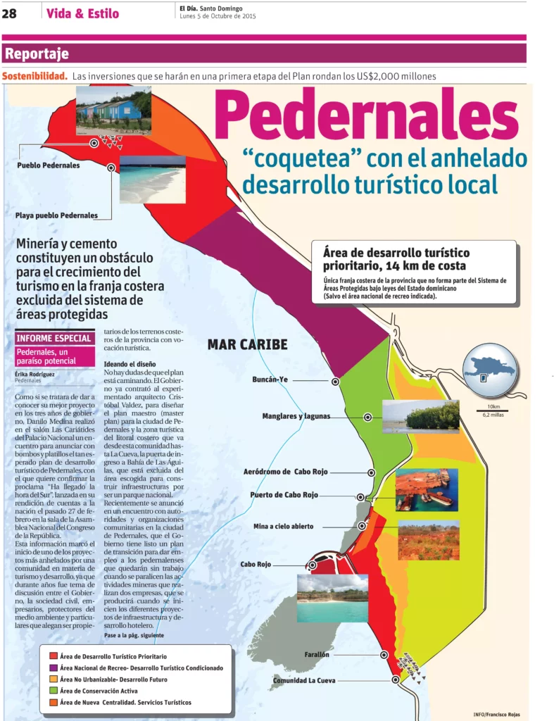 Como el 68% del territorio de la provincia Pedernales es área protegida, el desarrollo turístico se priorizará en la franja de 14 km de costa y 3 kilómetros de ancho, que comprende el litoral.