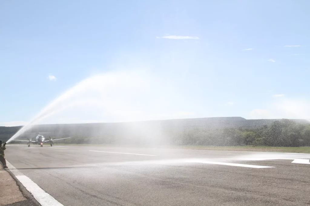 En un emotivo momento, el avión se detuvo en la pista de aterrizaje y fue cubierto por un arco de agua de dos camiones del Cuerpo de Bomberos de Pedernales, siendo este el tradicional saludo que se le da a las aeronaves como un gesto de bienvenida a los visitantes y bendición del nuevo vuelo. Luego, descendieron las autoridades y comunicadores invitados.