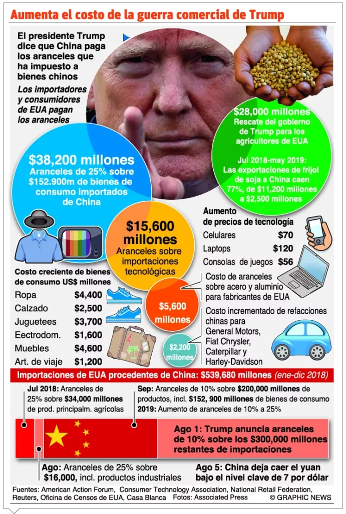 Y es que, aunque no las especificó, Pekín había prometido “represalias” después de que Trump indicase que impondría tasas del 10% a productos chinos valorados en 300,000 millones de dólares a partir del 1 de septiembre.