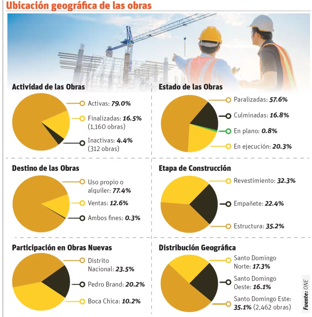 Apunta que la mayoría de las obras nuevas se concentraban en Santo Domingo Este, unas 2,462, representando el 35.1 % del total; el 17.3 % en Santo Domingo Norte y el Distrito Nacional con el 16.1 por ciento.
