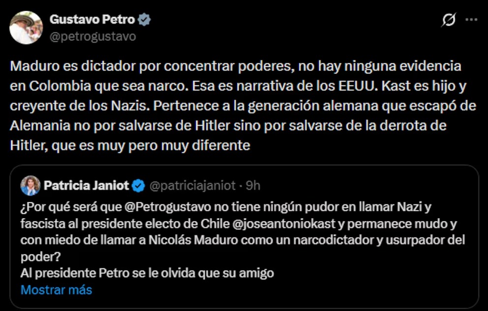 En su mensaje, la periodista recordó que Petro ha calificado en el pasado al presidente electo de Chile, José Antonio Kast, como “nazi” y “fascista”, y le reprochó no emplear términos similares para referirse al gobierno venezolano, al que acusó de usurpación del poder tras procesos electorales cuestionados.