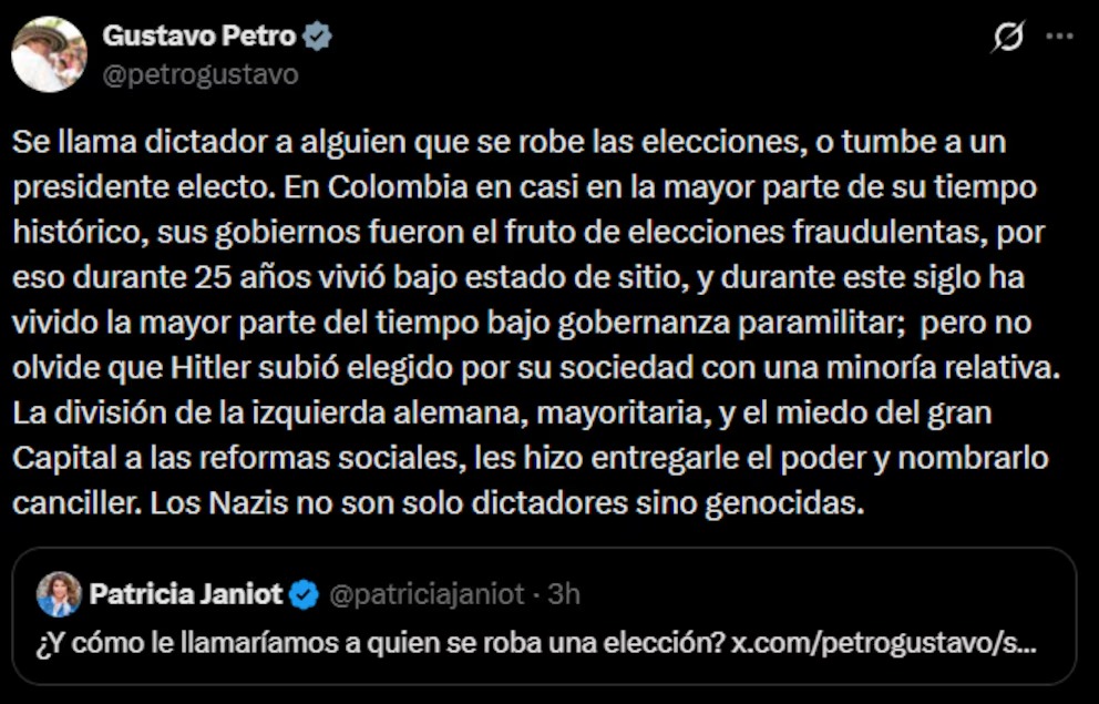El intercambio continuó cuando Janiot insistió en las denuncias de fraude electoral en Venezuela y preguntó cómo debía calificarse a quien se roba unas elecciones. Petro respondió que un dictador es quien vulnera la voluntad popular, ya sea mediante el fraude o el derrocamiento de un presidente electo.