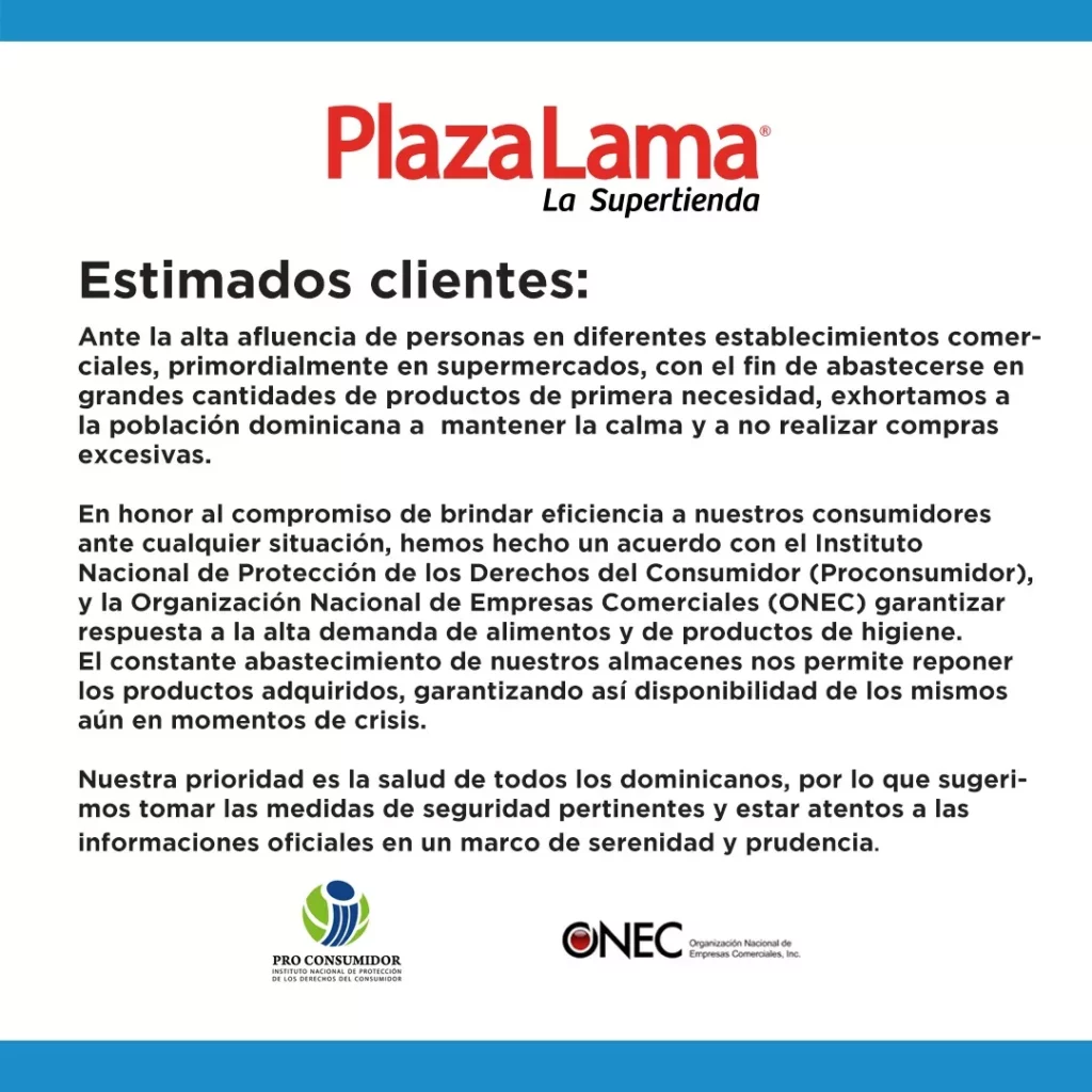 Plaza Lama expresó que su prioridad es la salud de todos los dominicanos, "por lo que sugerimos tomar las medidas de seguridad pertinentes y estar atentos a las informaciones oficiales en un marco de serenidad y prudencia".