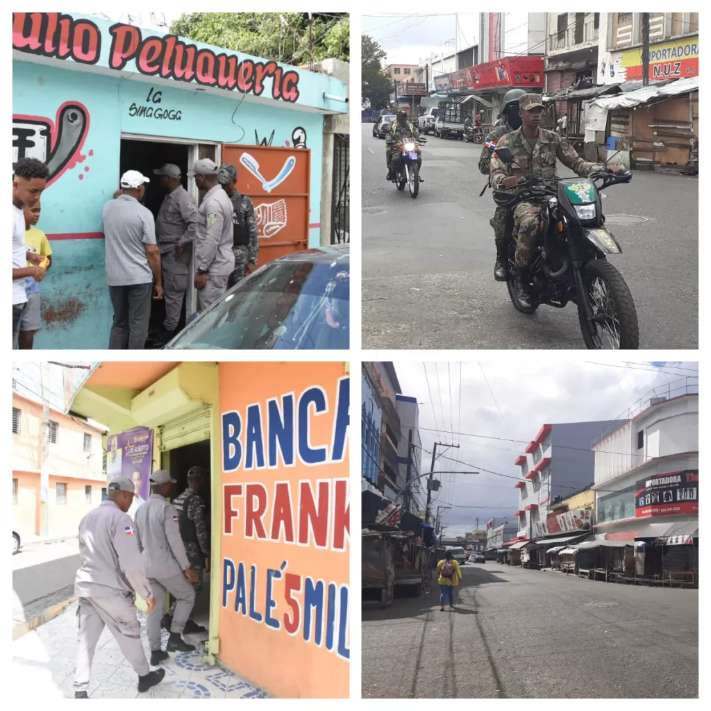 En el sector Maquiteria, en Santo Domingo Este, patrullas de la Policía Nacional transitaba por la calle primera cerrando los negocios que no eran de alimentos, tales como fantasías, peluquerías, billares, entre otros.