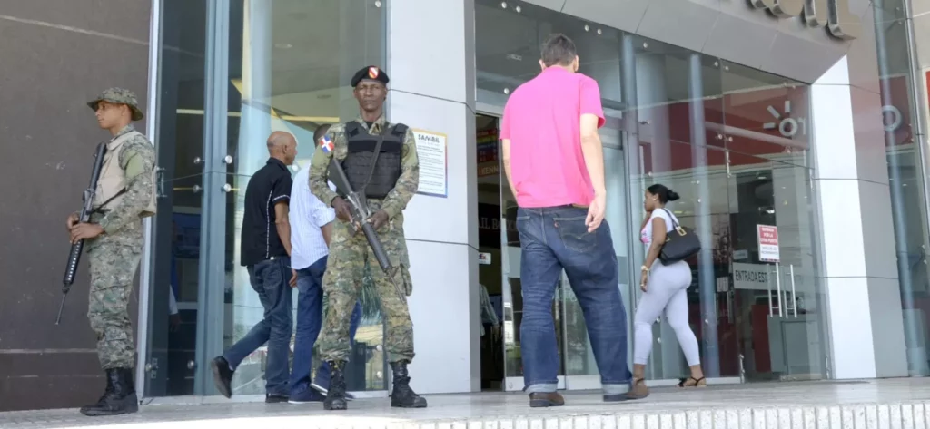 Algunos centros comerciales y zonas bancarias se han visto obligados a colocar en sus puertas efectivos militares portando armas de alto calibre, tras los asaltos atribuidos a la banda del fallecido Jhon Emilio Percival Matos, en diciembre pasado.