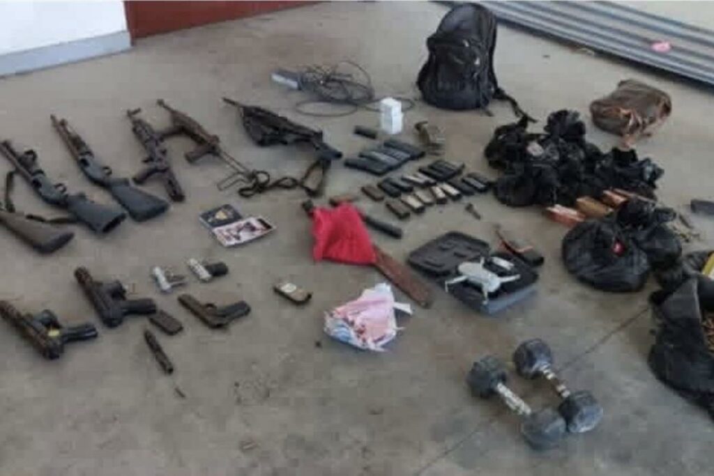 Entre el material incautado figuran un dron tipo Mavic, varias pistolas de calibres 9 mm y 22 mm, algunas de ellas falsificadas, armas de asalto como un fusil M16 y un fusil Kalashnikov falsificado, así como tres escopetas calibre 12.