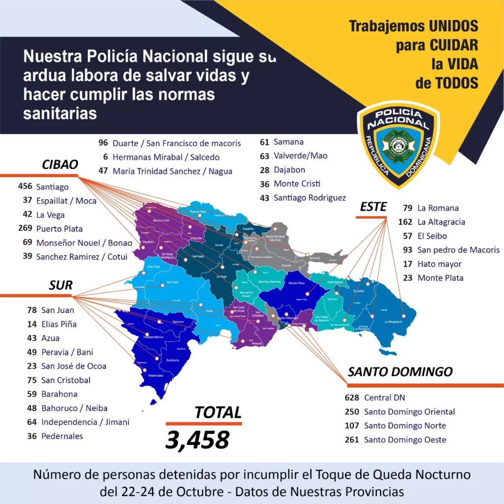 SANTO DOMINGO.- La Policía y las Fuerzas Armadas detuvieron a 3,458 personas por transitar en horario de toque de queda en operativos desplegados el jueves, viernes y sábado.