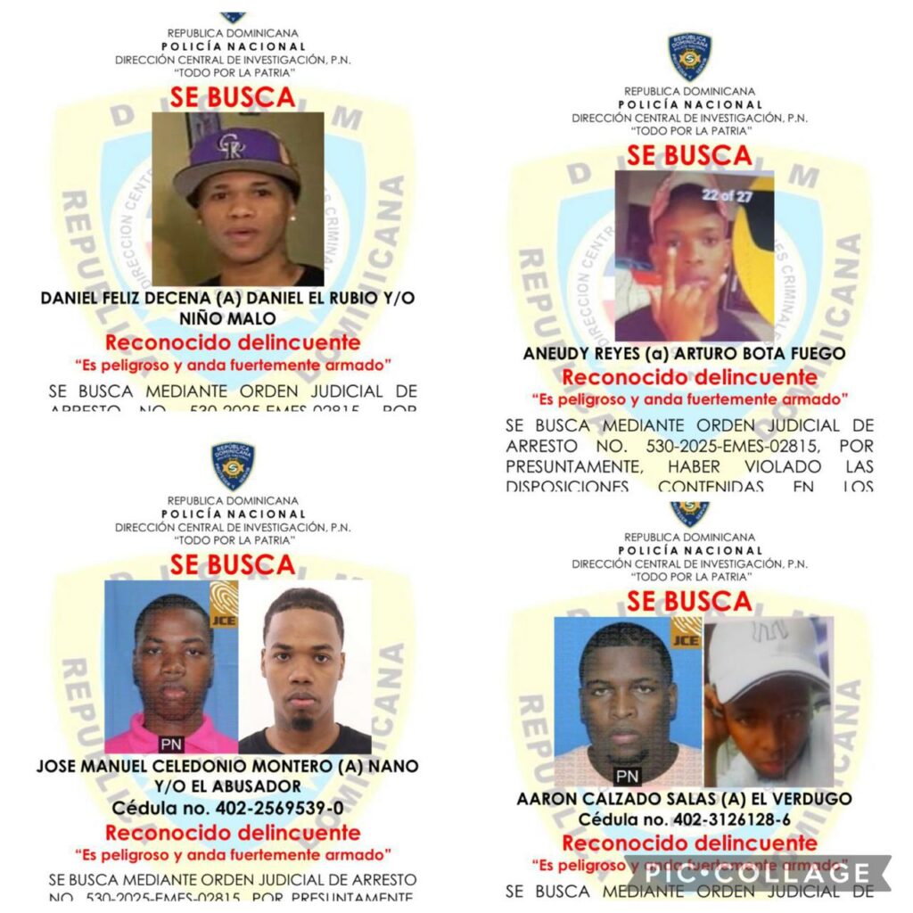 Los delincuentes fueron identificados como Aneudy Reyes (alias “Arturo Bota Fuego”), Daniel Feliz Decena (“Daniel El Rubio”), José Manuel Celedonio Montero (“Nano El Abusador”) y Aron Calzado Salas (“El Verdugo”), todos considerados altamente peligrosos y señalados como portadores de armas de fuego de distintos calibres.