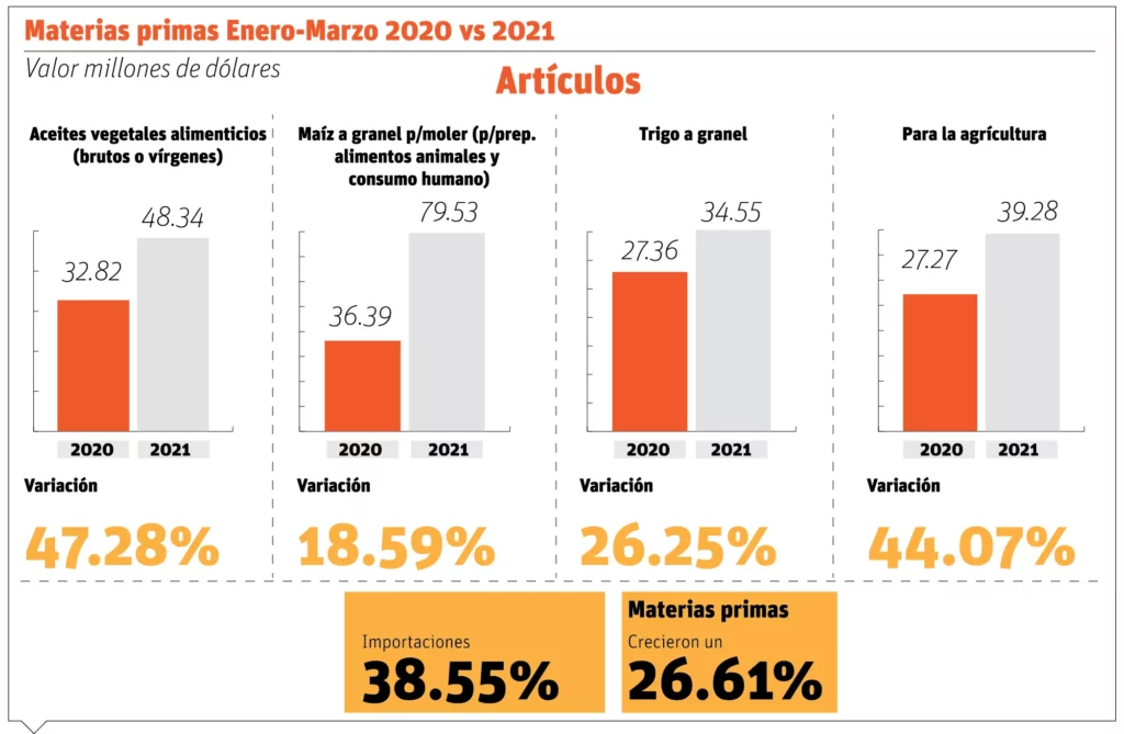 En el caso de los alimentos como el maíz, trigo, soya, grasas comestibles y leche, las distorsiones en la producción y en los canales de comercialización han encarecido los precios y generado en el país una inflación importada que ha hecho incrementar entre un 8 y 9 % el índice de precios de la canasta alimenticia, a pesar de que son bienes de cosechas locales.