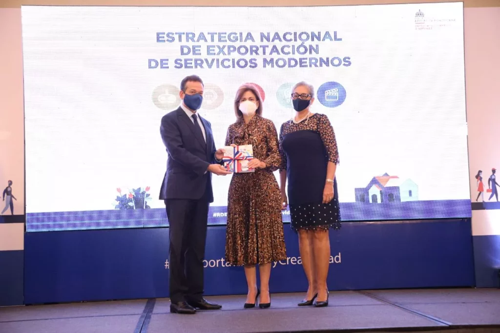 SANTO DOMINGO.- El Ministerio de Industria, Comercio y Mipymes (MICM) entregó a la vicepresidenta de la República, Raquel Peña, la primera Estrategia Nacional de Exportación de Servicios Modernos para impulsar la exportación en sectores de la economía creativa, la industria audiovisual, telecomunicaciones, informática, entre otros denominados Servicios Modernos.