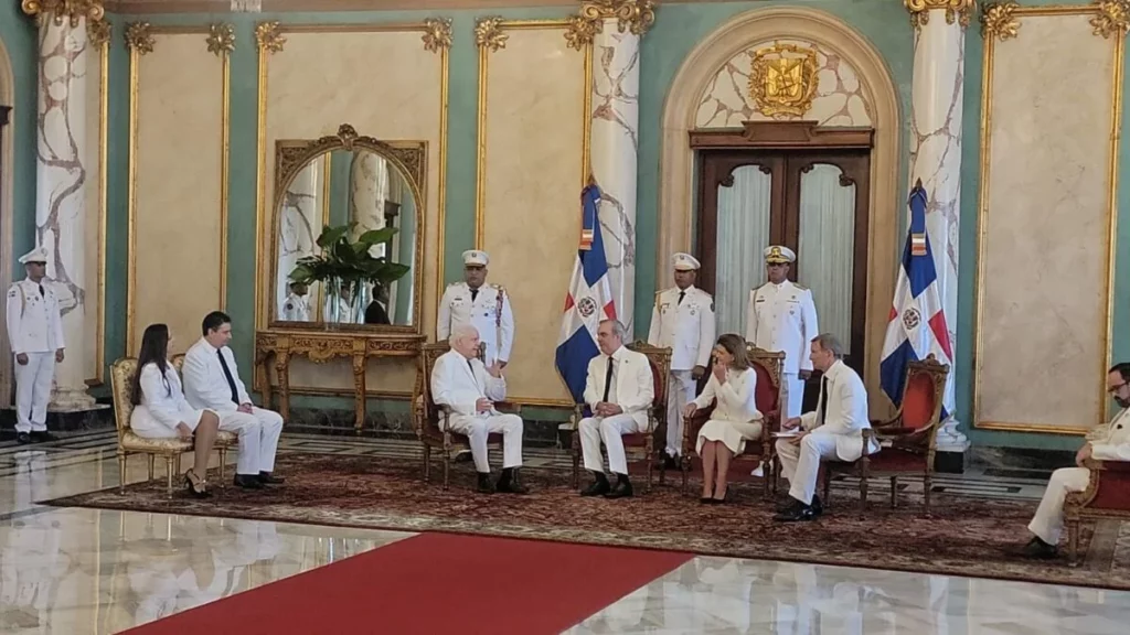 En el acto de entrega de cartas credenciales, también estuvo presente la vicepresidenta Raquel Peña y el ministro de Relaciones Exteriores Roberto Álvarez.
