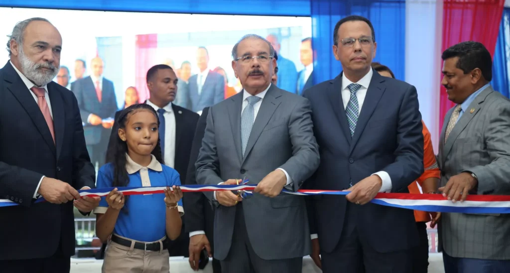 El jefe del Estado, acompañado del ministro de Educación, Antonio Peña Mirabal, pone en manos de la población del sector La Paz, Zona Franca del populoso sector Los Alcarrizos, una nueva infraestructura de 26 aulas, algunas de ellas para el nivel de Inicial.
