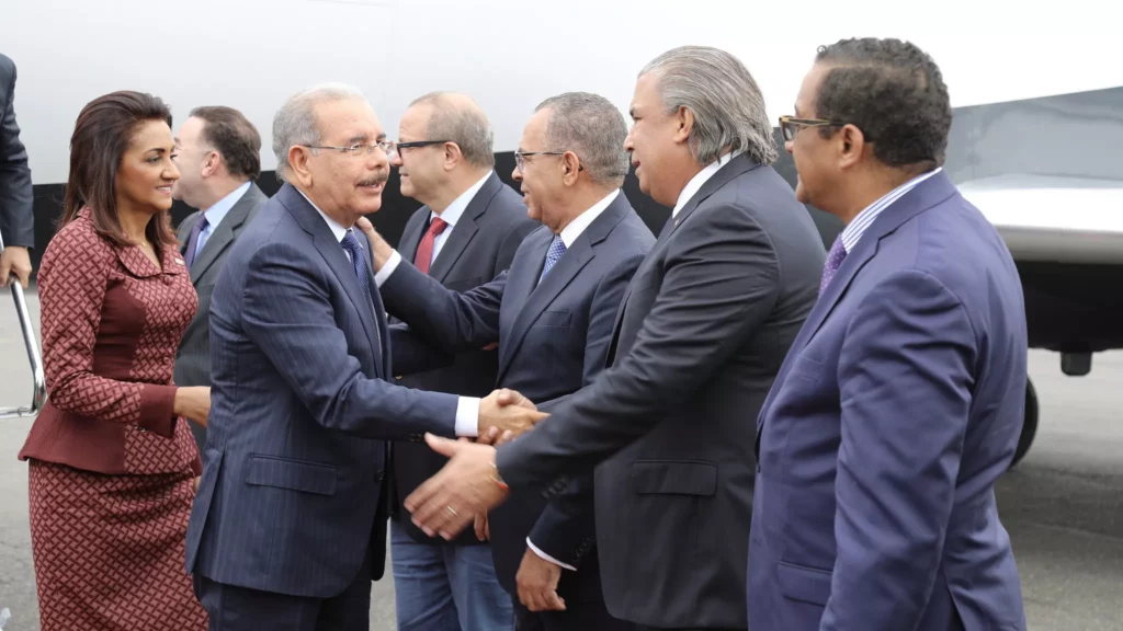 La delegación oficial dominicana está conformada por Miguel Vargas, ministro de Relaciones Exteriores; José Ramón Peralta, ministro Administrativo de la Presidencia; Donald Guerrero, ministro de Hacienda; Roberto Rodríguez Marchena, portavoz del Gobierno y director general de Comunicación y José Miguel González Cuadra, director ejecutivo de la Unidad para la Readecuación de La Barquita y Entornos (URBE).