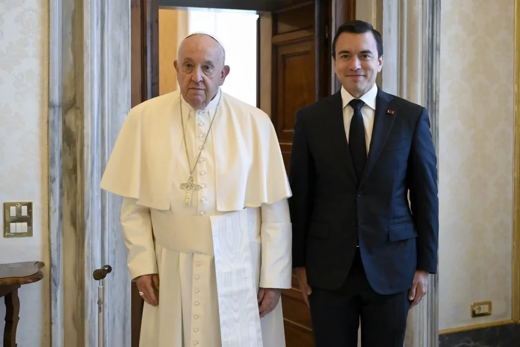La reunión entre el pontífice y Noboa, que realiza una gira internacional que le llevará también a Francia y España, comenzó a las 8.45 (6.45 GMT), antes del horario previsto, y concluyó a las 9.15 (7.15 GMT), y después se vio con el Secretario de Estado, Pietro Parolin, y con el Secretario para las Relaciones con los Estados, Paul Richard Gallagher.
