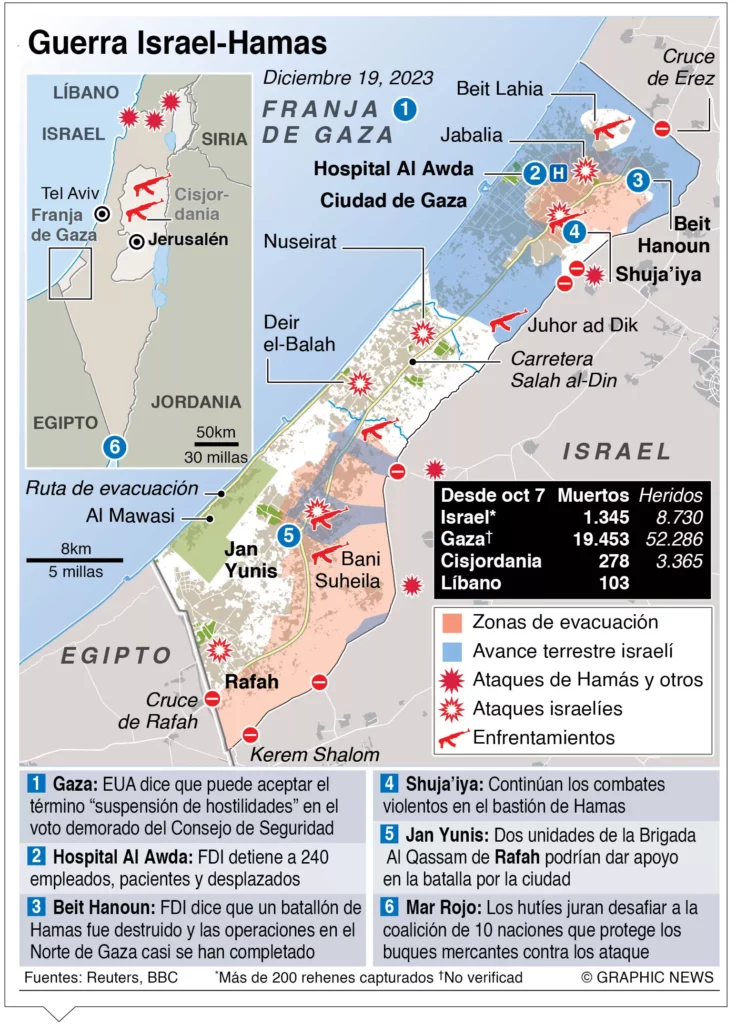 Tras el ataque de Hamás el pasado 7 de septiembre con más de 1.200 muertos y esos más de 240 secuestrados, Israel declaró el estado de guerra y lanzó una ofensiva militar por tierra, de Marzo y aire sobre el enclave palestino, con más de 19.600 muertos y más de 52.500 heridos según el Ministerio de Sanidad de Gaza, controlado por el grupo islamista.