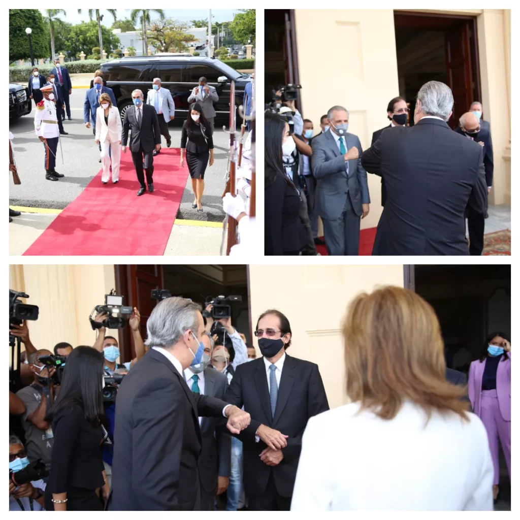 Abinader llegó a la casa de gobierno acompañado de la vicepresidenta electa, Raquel Peña, y su coordinador de campaña, Roberto Fulcar.