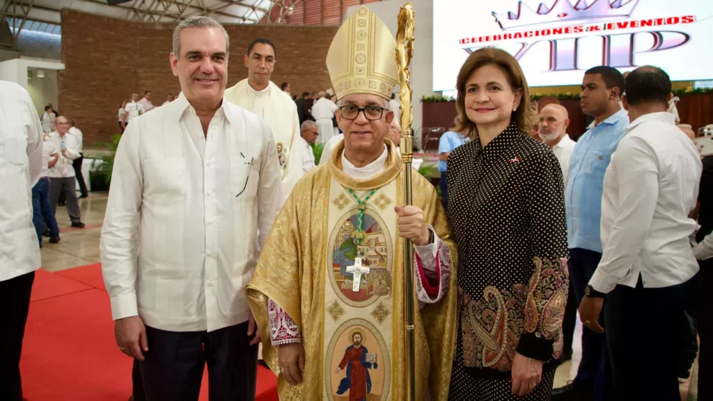 Santiago.- El presidente Abinader, acompañado de la vicepresidenta Raquel Peña, participó en la solemne ceremonia de toma de posesión del nuevo arzobispo metropolitano de la Arquidiócesis de Santiago de los Caballeros, monseñor Héctor Rafael Rodríguez, quien sustituye a monseñor Freddy de Jesús Bretón.