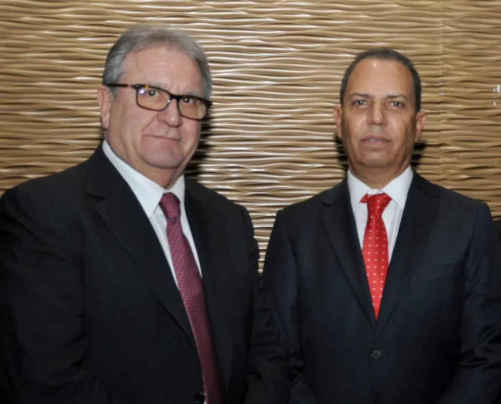 Ricardo Fraccari (izquierda), presidente de la WBSC-Béisbol/Softbol, felicita al ingeniero Garibaldy Bautista (derecha) recién electo presidente del Comité Olímpico Dominicana.